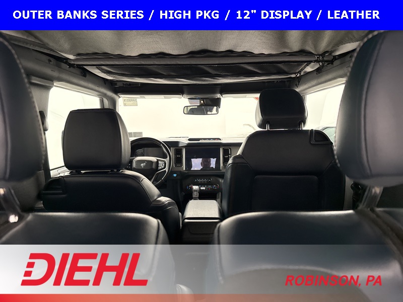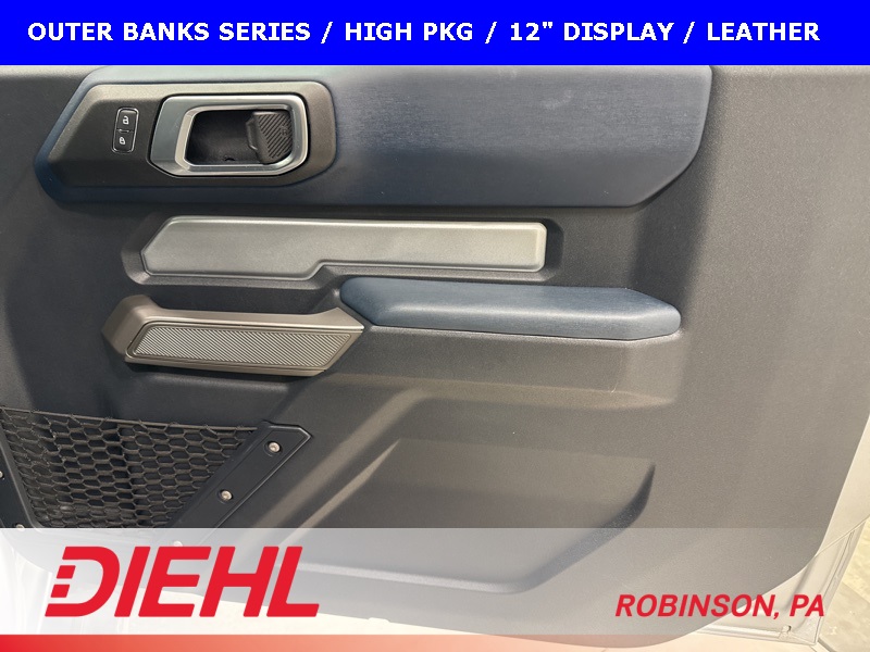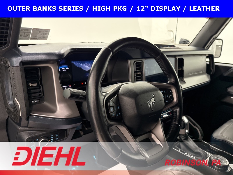 This 2021 Ford Bronco Outer Banks blends iconic Bronco styling with refined comfort and modern technology, making it just as confident on the street as it is off the beaten path. Finished in Silver with a gray and navy leather-trimmed vinyl interior, this 2-door Outer Banks delivers a sharp, upscale look while staying true to Bronco’s rugged roots.