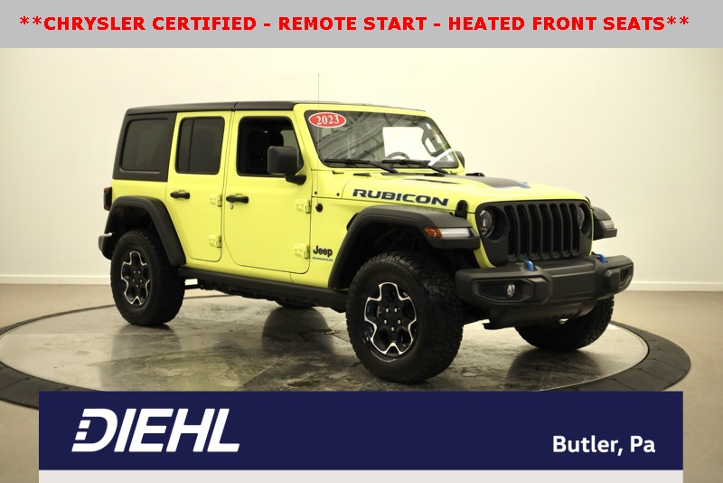 **BLUETOOTH HANDS FREE PHONE**, **BACK-UP CAMERA**, **APPLE CARPLAY / ANDROID AUTO**, **FACTORY NAVIGATION**, **FACTORY REMOTE START**, **HEATED FRONT SEATS**, **HEATED STEERING WHEEL**, **17" MACHINED WHEELS**, **REMOTE KEYLESS ENTRY**, 2.0L I4 DOHC, 4-Wheel Disc Brakes, 4.10 Rear Axle Ratio, 9 Speakers, ABS brakes, Air Conditioning, Alloy wheels, AM/FM radio: SiriusXM, Apple CarPlay/Android Auto, Auto-dimming Rear-View mirror, Automatic temperature control, Body Color 3-Piece Hard Top, Brake assist, Cold Weather Group, Compass, Delay-off headlights, Driver door bin, Driver vanity mirror, Dual front impact airbags, Dual front side impact airbags, Electronic Stability Control, Emergency communication system: SiriusXM Guardian, Freedom Panel Storage Bag, Front anti-roll bar, Front Bucket Seats, Front Center Armrest w/Storage, Front dual zone A/C, Front fog lights, Front reading lights, Fully automatic headlights, Garage door transmitter, Heated door mirrors, Heated Front Seats, Heated Steering Wheel, Illuminated entry, Integrated roll-over protection, Low tire pressure warning, Navigation System, Occupant sensing airbag, Outside temperature display, Panic alarm, ParkView Rear Back-Up Camera, Passenger door bin, Passenger vanity mirror, Performance Suspension, Power door mirrors, Power steering, Power windows, Premium Cloth Low-Back Bucket Seats, Radio data system, Radio: Uconnect 4C Nav w/8.4" Display, Rear anti-roll bar, Rear reading lights, Rear Window Defroster, Rear Window Wiper/Washer, Remote keyless entry, Remote Start System, Security system, Speed control, Split folding rear seat, Steering wheel mounted audio controls, Tachometer, Telescoping steering wheel, Tilt steering wheel, Traction control, Trip computer, Variably intermittent wipers, Voltmeter, Wheels: 17" x 7.5" Machined w/Black Pockets. CARFAX One-Owner. Clean CARFAX. High Velocity Clearcoat 2023 Jeep Wrangler Rubicon 4xe 4WD 8-Speed Automatic 2.0L I4 DOHC